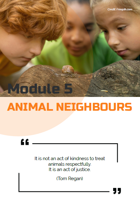 Animal Neighbors is a module designed to provide information and guidance on various animals that are commonly found as neighbours or inhabitants of our surroundings. Whether you live in a rural area, suburban neighbourhood, or even an urban setting, chances are you will encounter different types of animals in your vicinity. The activities are designed to strengthen the connection with and appreciation of the animal world within young people.